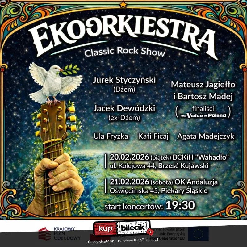 bilety: Klasyka rocka w ekologicznym wydaniu! Przygotujcie się na niezapomniany wieczór z Ekoorkiestrą! Zapraszamy na "Classic Rock Show", podczas którego usłyszycie największe hity legend muzyki: The Beatles, Led Zeppelin, Depeche Mode, Janis Joplin i wielu innych! Wystąpią dla Was wyjątkowi muzycy oraz wokaliści: Jurek Styczyński (Dżem), Jacek Dewódzki (ex-Dżem), Mateusz Jagiełło i Bartosz Madej (finaliści The Voice of Poland), Ula Fryzka, Kafi Ficaj, Agata Madejczyk oraz zespół Made in Warsaw. Kiedy i gdzie? 21.02.2026 (sobota) - Piekary Śląskie, OK Andaluzja, ul. Oświęcimska 45 Made in Warsaw artyści: Tribute to Deep Purple & Rainbow, Doogie White, Tony Carey i inniTo już 11. edycja Memoriału Jona Lorda, a co za tym idzie - właśnie stuknęło nam 10 lat działalności pod szyldem Made in Warsaw! Początkowo jedynie okazjonalnej, corocznej przygody z muzyką współtworzoną przez Jona Lorda, w ostatnim okresie bardziej intensywnej, związanej z trasami koncertowymi, a zwieńczoną wisienką na torcie w postaci autorskiego utworu "Chory Sen" (a to nie jest nasze ostatnie słowo w tym temacie. Bilety do nabycia na: KupBilecik.pl |